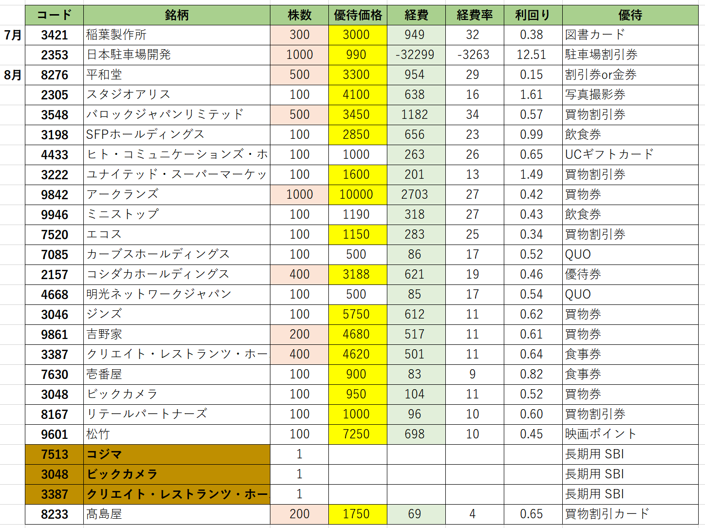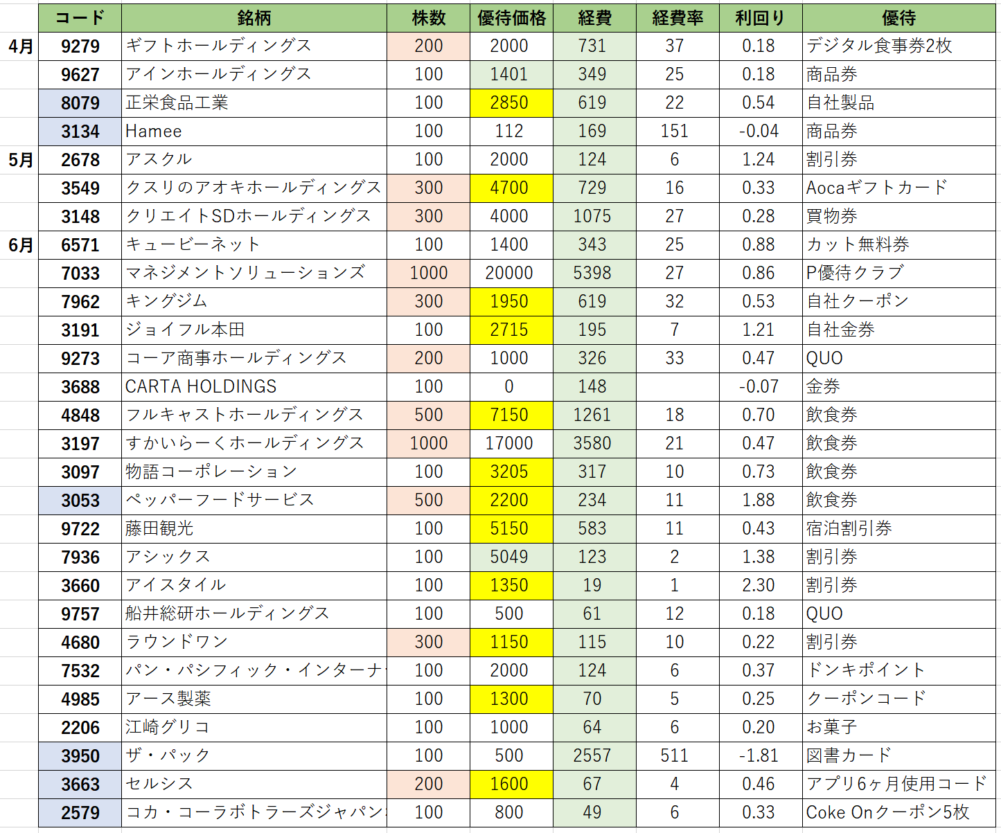 優待価格欄が「黄色」は転売予定で、まだ確定した数値ではありません(多いなぁ・・汗)