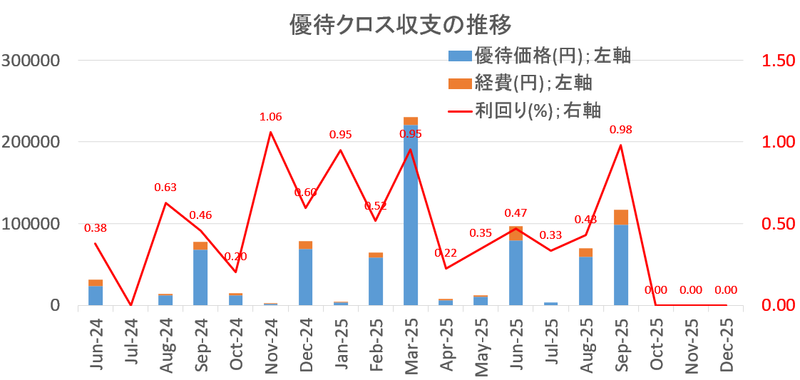 次に、これまでの優待クロスの利回りと収支をまとめてみました(下図)。