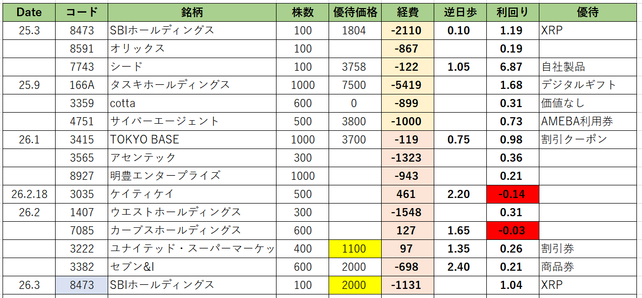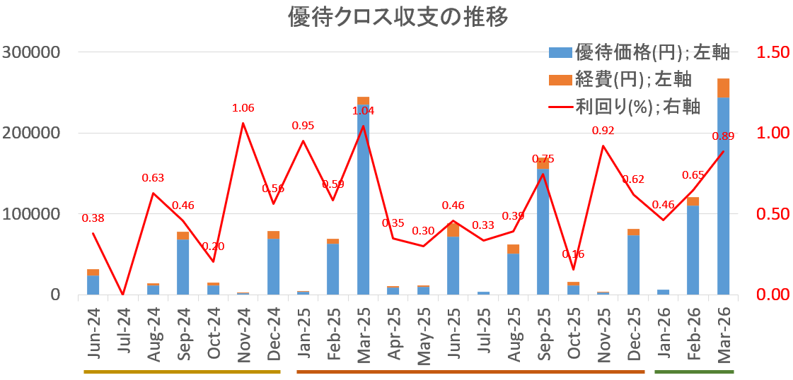 24年6月から始めた優待クロスは(何も取れなかった月を除き)26年3月で1年10ヶ月目に突入しました!