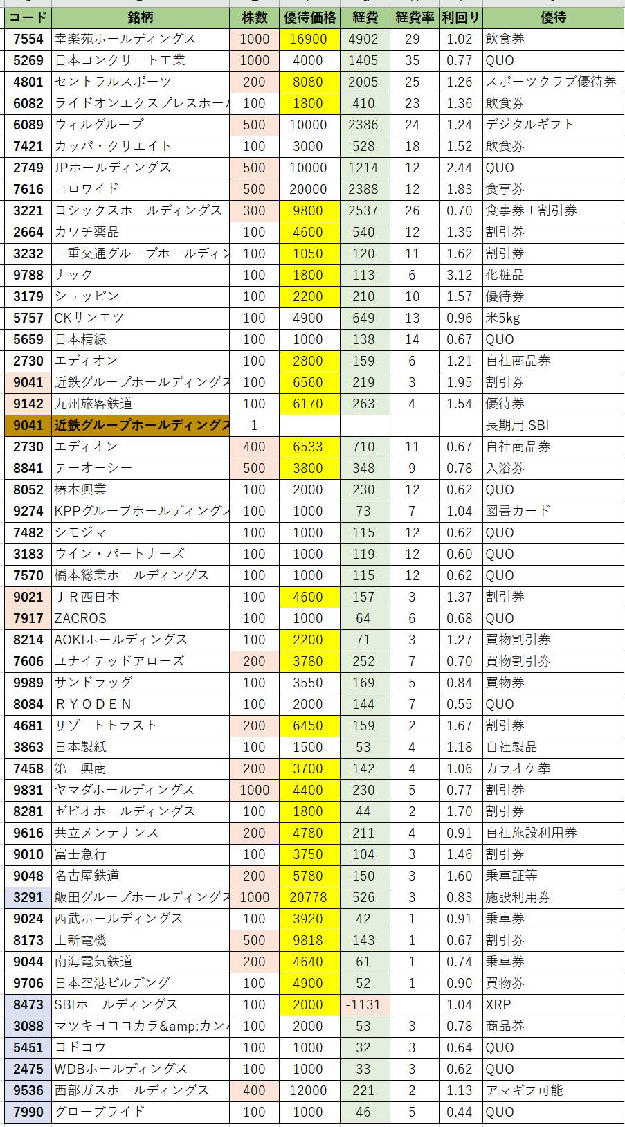 優待価格欄が「黄色」は転売予定で、まだ確定した数値ではありません。